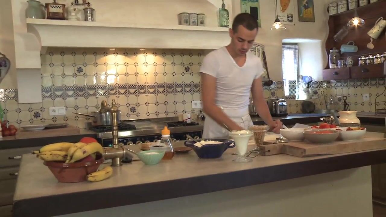 Here's the translation and reformulation of the gay porn video description: "Today's recipe features a hot threesome between French guys. The chefs throw off their aprons and end up naked on the kitchen counter while fucking in the middle of the food. A bit messy but incredibly exciting with Fabian Esteban and his three buddies."