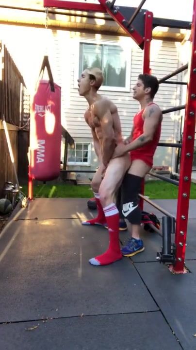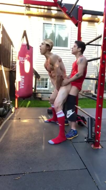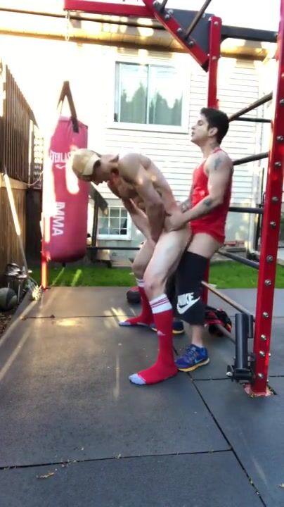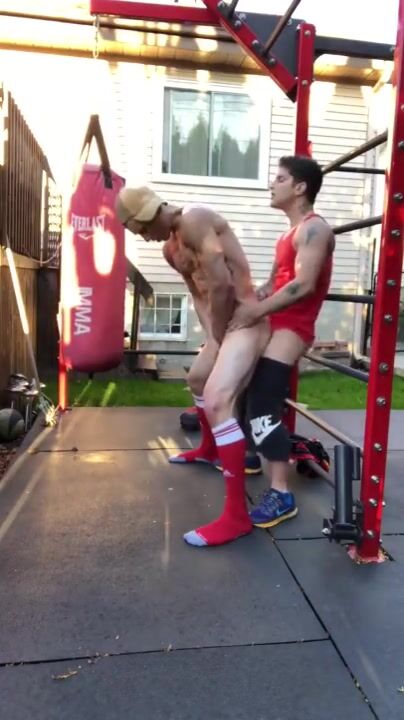 Two handsome men are fucking in the garden.