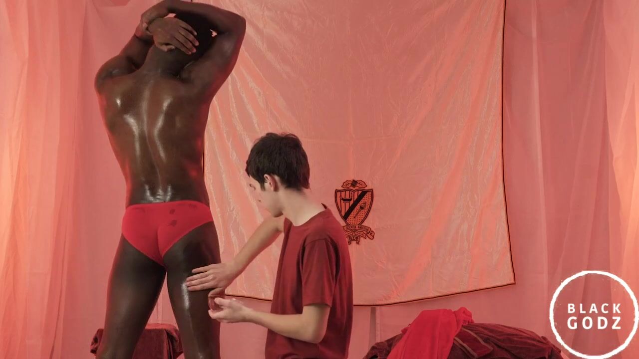 This young guy is serving a handsome Black athlete who practices Body Worship. He must have well lubricated all the body to be very shiny. It's an occasion for him to enjoy his muscular tension. The caresses are very intimate and soon the JH will find himself naked, as the Black athlete excited wants to give him a blowjob before going on stage.