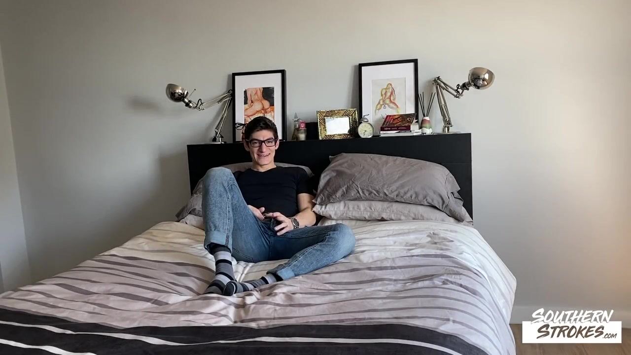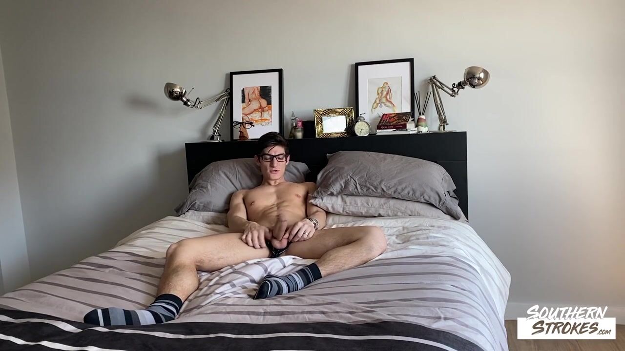 Aiden Ward is a handsome college student with an impressive body and no hair on his chest. He masturbates while lying on his bed. He wears glasses which adds a sexy nerdy touch to his charm.