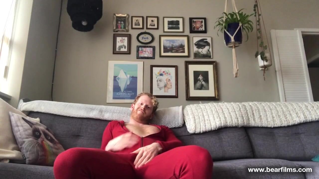 A bearded man masturbates alone.