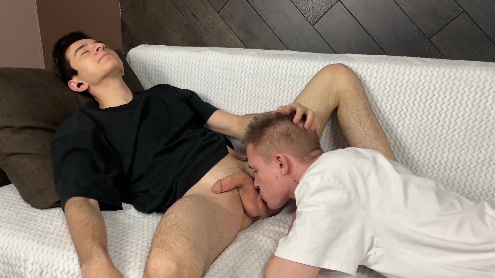 blow job on sofa with cum in mouth and on body