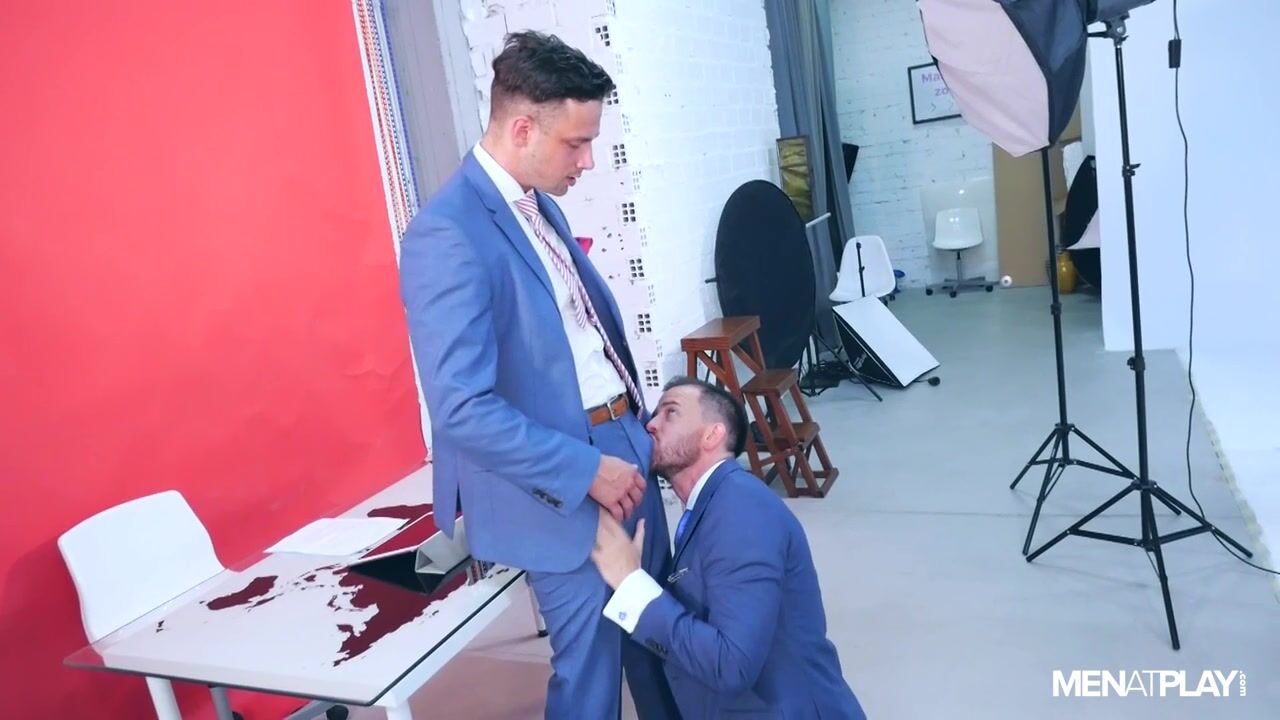 After much effort (see previous video) to obtain an increase, Franky Fox completes his first week at his job. Damon Heart, the media manager of the station, has observed Franky's excellent performance. After everyone is sent home for the weekend, Franky asks Damon how he can improve. Damon tells Franky that he knows he slept with his former assistant to help him advance; and it shows he is the right guy for the team! Why stop at sleeping with your assistant? Franky lets his boss Damon kiss him on the news desk... except that he doesn't know that the cameras are always recording!