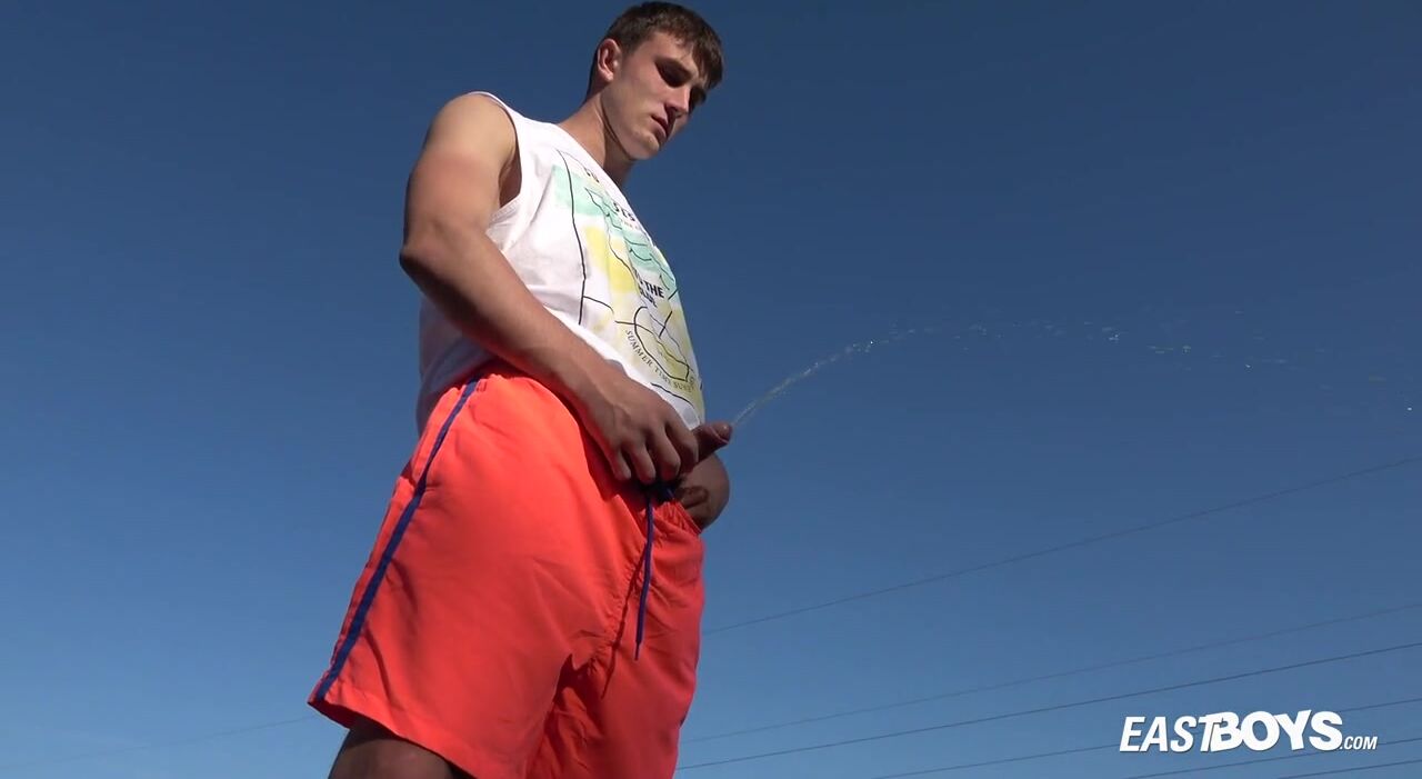 A straight guy urinates in the wild nature. A bit exhibitionist, he doesn't hesitate to lower his shorts to show his dick.