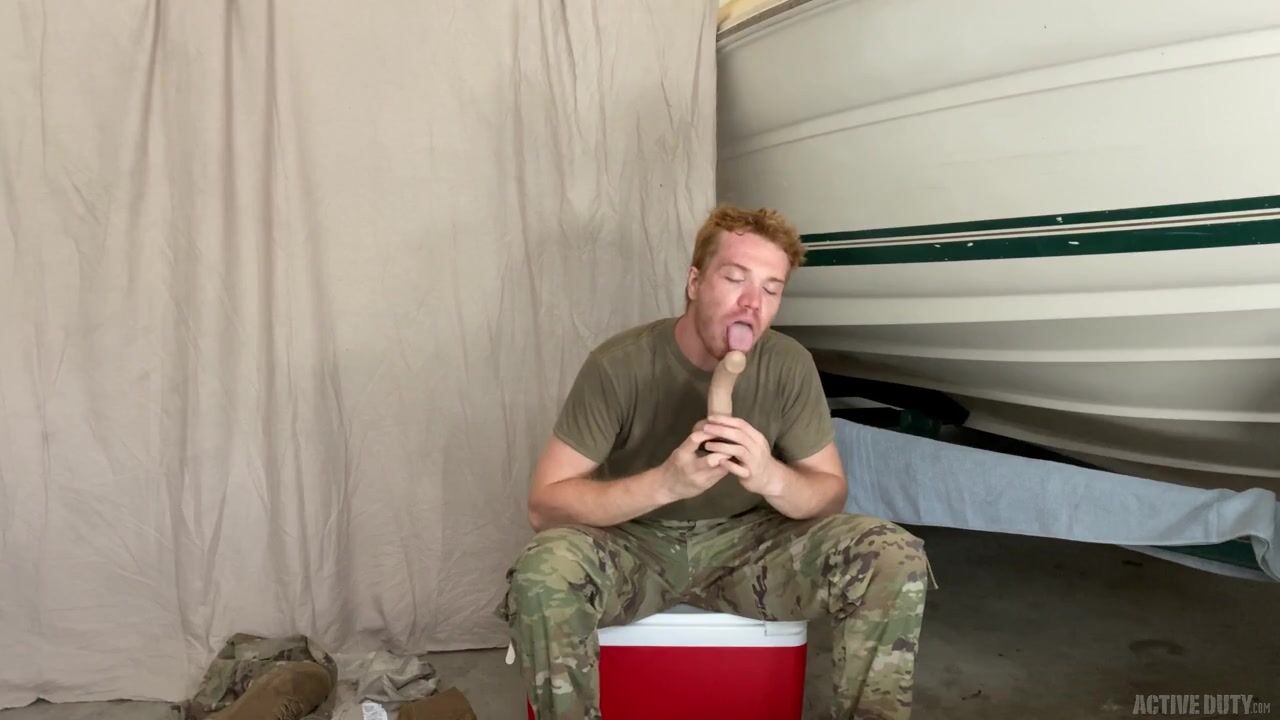 This red-haired soldier lowers his army trousers to masturbate.