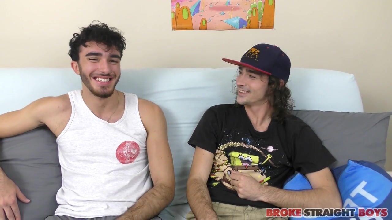 Mikey is a College Boy Physicals site sibling, but he considers himself straight and only sucks guys if he's paid, so we invited him to BrokeStraightBoys to help with the transition. We also brought our boy Gino so they could play together. They undressed and when their bare asses were on the couch, they started sucking dicks. Gino gave Mikey a blowjob first, sucking carefully on Mikey's tip until he was challenged to go deeper. He took that dick more deeply into his mouth. They played with each other more, and then Mikey tried to give Gino a blowjob, massaging that prick with his tongue and lips while Gino sat back and watched him work the dick. When they were both hard and horny, Mikey got on all fours on the bed and waited for Gino's big dick to penetrate his tight hole. Gino might not be able to kiss men, but he seems to really enjoy gay sex as he sucks Mikey's cock roughly and deeply. He pounded that dick into and out of Mikey's tight ass, filling up that small hole with cum as those two guys became hard, sperm spilling over Mikey's abs while they continued this amazing orgasm.