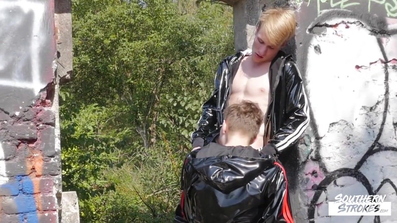 Curtis and Robbie do what young men do, smoking weed and having sex in an abandoned building. Robbie starts by dropping Curtis's pants, grabbing his hard dick and licking it wet. He then kneels to get Curtis's rock-hard dick, working the shaft and balls with his warm tongue before taking it deep. He then stands up straight and takes Curtis's dick in a deep throat before sucking on his friend's penis before slamming it down on a wall, legs raised high, and deep-throating it thoroughly. Curtis loves Robbie's mouth but takes a turn by sucking his friend's hard cock before stretching it out on the wall, raising his legs, and burying his face in his ass deeply. Curtis gags a bit to let Robbie know who is in charge, while licking his friend's hard dick. Robbie loves it, giving his hole to Curtis as he caresses his hard dick while filling up. Curtis chok*es a little to let him know who's the boss, and then puts Robbie on his back and fucks his ass deeply until Robbie cums everywhere on his stomach. Curtis then turns around and pumps his own dick out of his asshole, splashing all over Robbie's chest. They both cum, filling the room with their abondant semen.