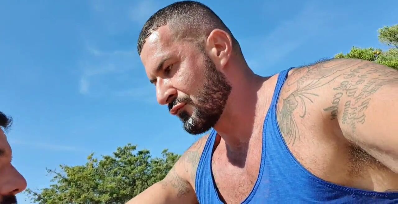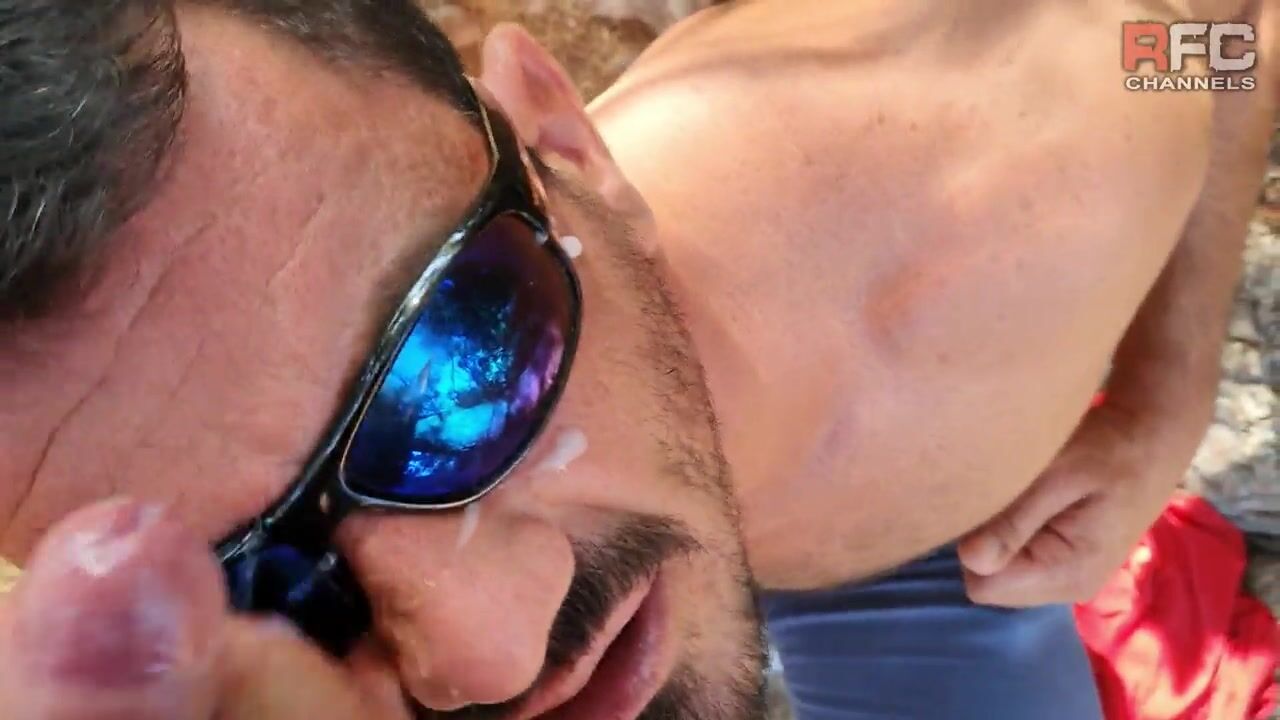 On a nude beach, a firefighter gets dosed in the face. His juicy mouth is dosed by a powerful blast of semen.