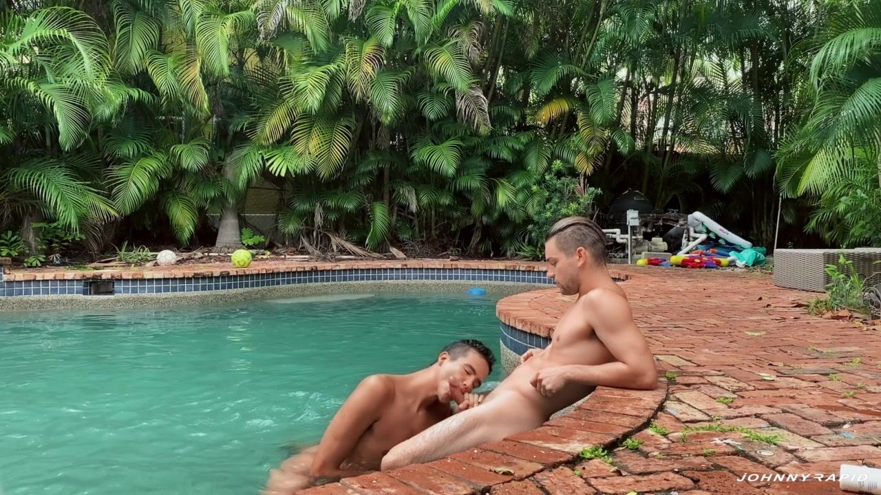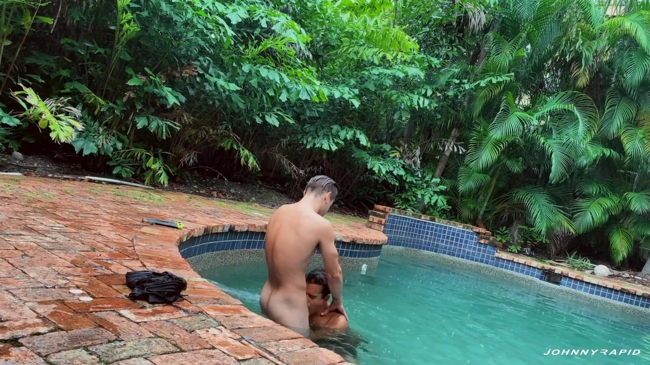 As Johnny Rapid gets hardened up his famous dick, the newcomer Johnny Bandera relaxes with some holes and handrails at the edge of the pool. Johnny B. isn't there to show off his flexibility, however, he is there to suck Johnny R.'s dick underwater! The guys enter the pool, and Mr. Bandera deep-throats Johnny's dick underwater! Then he shows how long he can hold his breath while he submerges his head in the water. Mr. Rapid bends the bottom on the edge of the pool to pound his ass like a doggy style, then sits on the steps for Johnny B. to sit on his dick. The bottom rides this dick until it ejaculates. He lies back and spreads his legs very wide while Johnny pounds his hole, then he squats completely apart to wait for an ejaculation face from Johnny Rapid.