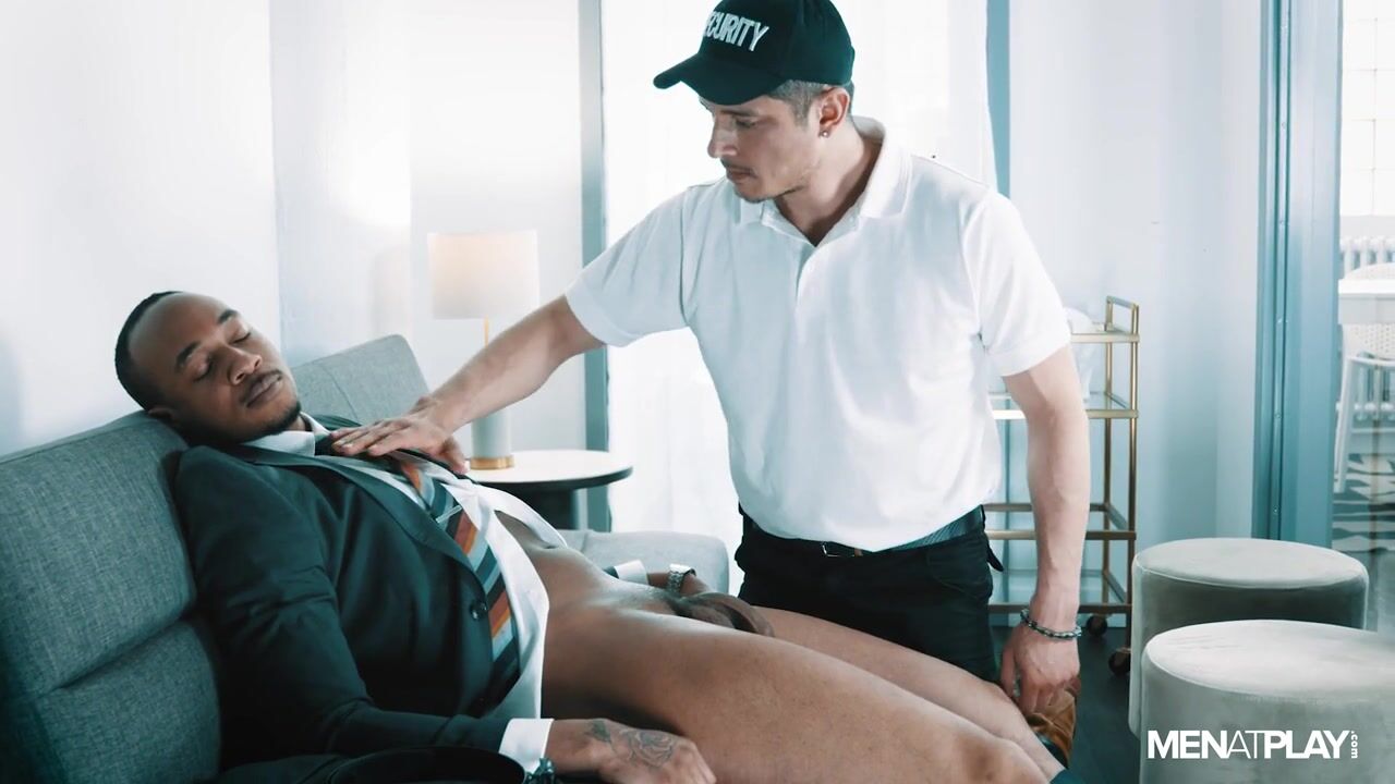 It's now Saturday morning and Rocky Vallarta, the security guard of the office, enters into the office of the boss during his tour. It seems that the boss has had a long night of work and he finds him deeply asleep on the couch. He notices an obvious bulge and a dildo nearby. Should he wake him up? Or should he have a quick feeling? Rocky didn't hesitate - he went directly to the swollen penis of Trent and sucked it slowly without waking him up. However, as careful as he was, the boss ended up coming out of his sleep and turned over quickly Rocky while undressing him and kissing his smooth and tight ass.