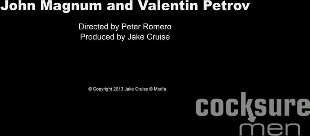 John Magnum and Valentin Petrov compare the sizes of their dicks in the living room. Their dicks rub against each other as they determine who has the biggest and longest dick. John wants to see who is the biggest when he is completely hard, so he gets on his knees and sucks Valentin's hard dick, making it even harder. Valentin gets on his knees and blows John's hard dick from the head to the base. They exchange blowjobs until Valentin throws John onto the couch and shoves his tongue down John's ass. Once John's warm hole is completely wet, Valentin plunges his massive thick dick deep into him. John stands up and sits on Valentin's dick, riding it hard while Valentin gives him a spanking. Turning around, John continues his joyful ride on Valentine's pole. John gets on his back and takes Valentin's hard dick slowly and deeply as they passionately grind together. Valentin pumps his massive thick dick in and out of John's ass slowly and deeply until John explodes his load all over his own hairy abs. Valentin deposits his load everywhere in John Magnum's ass until John shoots his load all over his own rough abs. They finish with a kiss of gratitude.