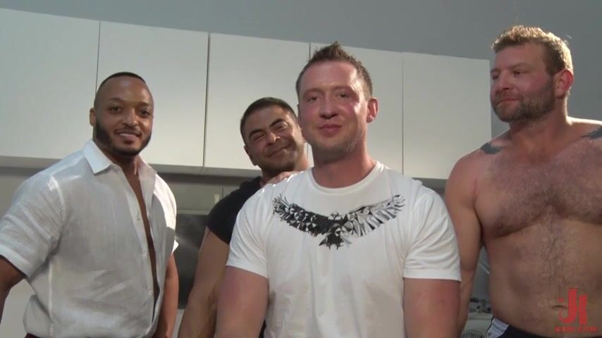 Dr. Draven Navarro and his muscular perverted nurses Dilon Diaz and Colby Jansen continue the perverse and debauched pleasure with the disordered patient Pierce Paris in American Gangbang part 2.Blindfolded with a bandage, gagged and tied to a medical examination table, Pierce caresses his cock with each hand while he receives a series of electrical shock treatments to adjust his attitude and warm him up for what is about to happen.With a TENS unit pulsating electric current through his muscles, the purple wand vibrates and buzzes as it stimulates his ass hole while he writhes and moans thanking the gangbang nurses and begging them also to stop.Dr. Navarro wants a piece of this little man's ass so he administers an injection in the butt with his big dick and beats Pierce's tight ass during their dirty talk and group sex until everyone takes turns sucking on his face. Pierce is rigid with a big dick in his mouth while they all bang his impotent ass until each one shoots a huge load on his face.