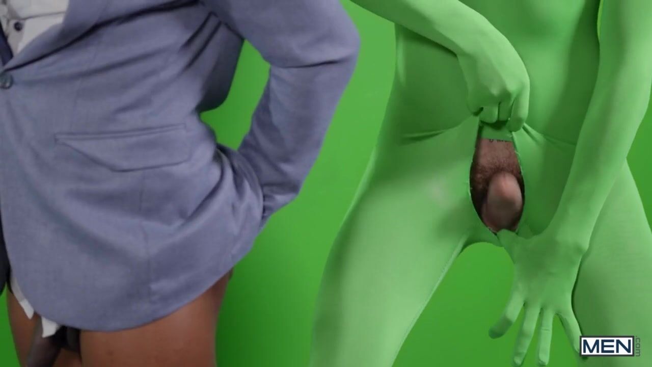 Chris Damned is waiting backstage when the meteorologist Adrian Hart invites him to come out and start sucking on his cock. He sneaks into a green jumpsuit and slides into the frame, dancing in a storm in front of a green screen, then bends down the pants of the meteorologist! Chris tears a hole in his costume and waves his hard dick around before sucking Adrian in doggy style on live TV. At the end of the show, Adrian sucks Chris's hard cock, and the guys head towards the backstage where Chris bends Adrian over a desk and teases his hole with his tongue before giving him several inches of dick. Adrian rides Chris's dick and sprays his chest with cum, and Chris offers 100 chances to win on Adrian's cock.