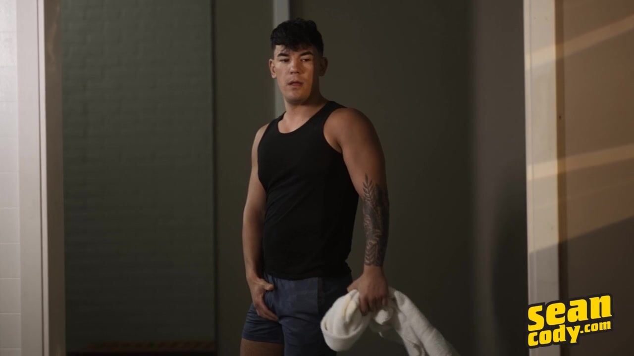 After his workout, Beck enters the locker room and notices that JC and Josh are nearby. The view is hot enough for him to start touching himself, rubbing his chest, and even lowering his shorts to stroke his dick after the other men have left the gym.