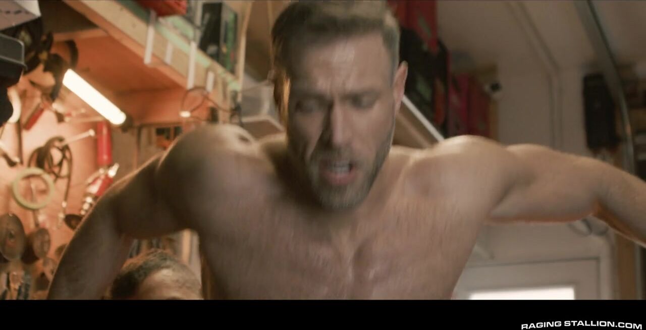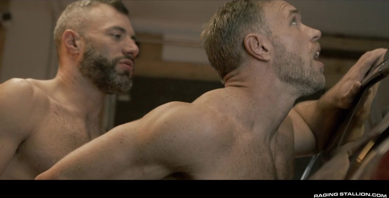 "Alex Mecum is out of the racing game for a while and hesitates to help driver Cole Connor understand what's wrong with his car, but some persuasive convincing from Cole's mouth could possibly change that. The desperate racer begins to tongue-wrestle Alex's hairy dick and smooth hole in the middle of his automotive store before bending him over his desired race and making a test drive. Ready to take himself a turn on the driver's seat, Alex speeds into Cole's garage and barebacks his daddy hole. He fucks Cole's sweaty ass until his own cum sprays on Alex's face. Proving he is still a stud himself, Alex strokes until he gives Cole an XL dose of fresh charge. "