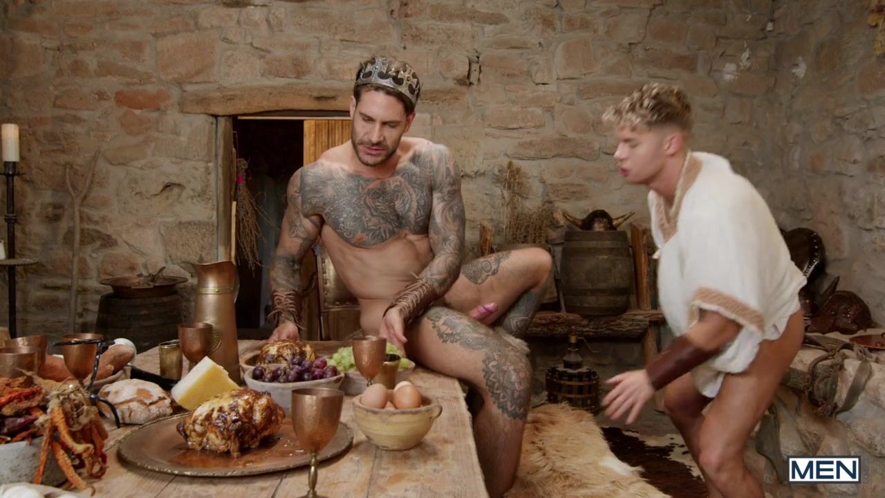 The Scandinavian king, Papi Kocic, thinks it's just another day, indulging in his fiercest warriors, while the miniscule Dean Young sits on his knees and fills his glass... until Sir Peter's terrible news arrives: Dracock the Dragon is approaching, and Loki will only feed on chaos and destruction. The god himself appears, and the king begs him to find Thor, thunder god, to save them, while under the table Dean tastes a royal cock. When Loki sets out to find Thor, Papi fucks the minion and gives him a spanking before pounding his ass like a lion. As Papi's muscular body is worshiped, Dean sucks on his chest and licks his abs and arms, then rides the king while Papi takes on a stand-and-carry position. Dean enjoys as Papi kisses him on the table before bending over and taking the hot load of the top into his ass.