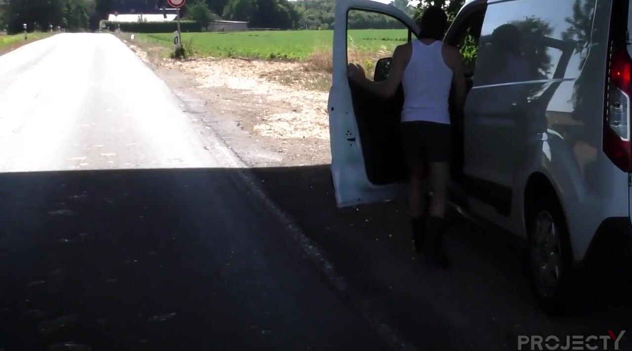 "Hard bareback sex on the side of a road. A bad boy fucks in doggy style a submissive at the back of his pickup truck."