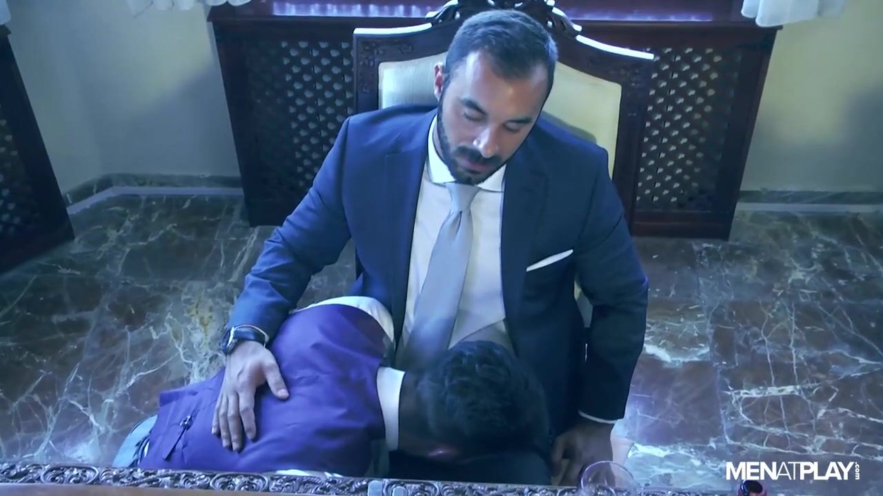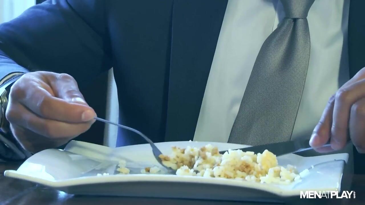 Sometimes eating alone at home is more satisfying than eating out, especially when you have a private chef and butler at your disposal. From a distance, what seems like a civilized dinner for Xavi Duran is actually a sleazy play session. Robbie knows his master's strong sexual hunger for boy-next-door-looking and submissive male "help". And as Xavi finishes his last sip, he is already receiving his dessert under the table in the form of young Robbie Rojo sucking on his meaty cock. Xavis butler goes beyond the call of duty to serve his master. And the more Xavi makes Robbie gag on his cock, the more he eagerly continues to satisfy his boss. Xavi pushes Robbie down on the table in front of him to reveal his suited ass, the trouser material stretched tightly across Robbies butt. Xavi prods and teases Robbies hole through the trousers before pulling them down to eat out on Robbie's ass before pounding him deep.