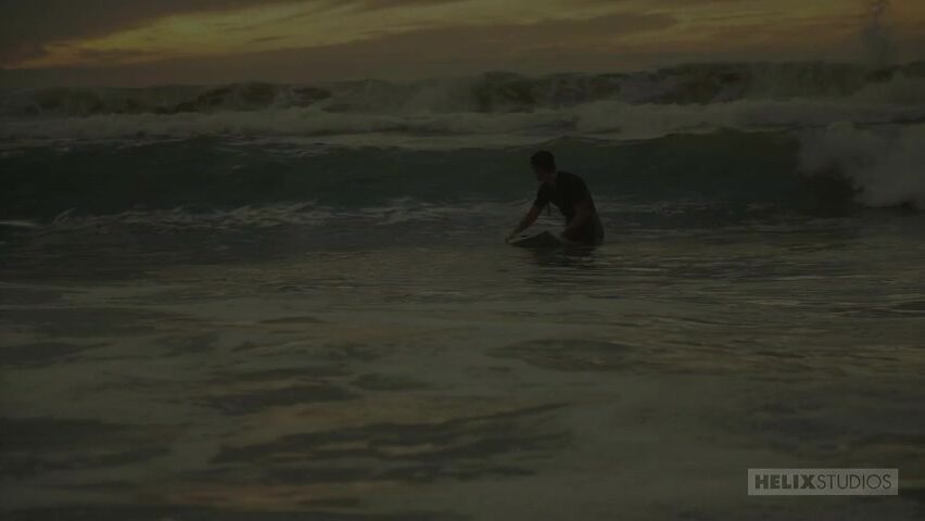 chiseled physique is on full display as he takes off his wetsuit to reveal a tight pair of swim trunks that hug every muscle in his body. He leans back against his board, eyes closed, feeling the sun on his skin and the breeze in his hair. As he opens his eyes, he spots a group of guys