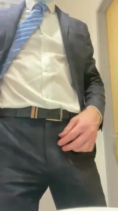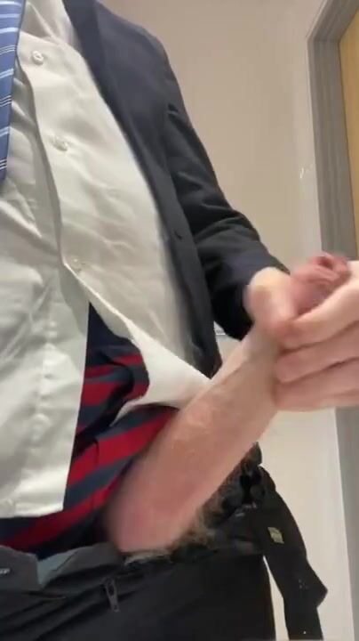 Suited manager masturbating at work - horny, hard and uncut straight guy cumming