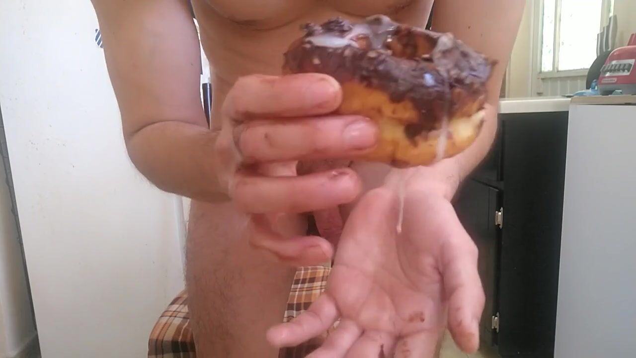 Handsome man fucks a donut, cums on it and eats it