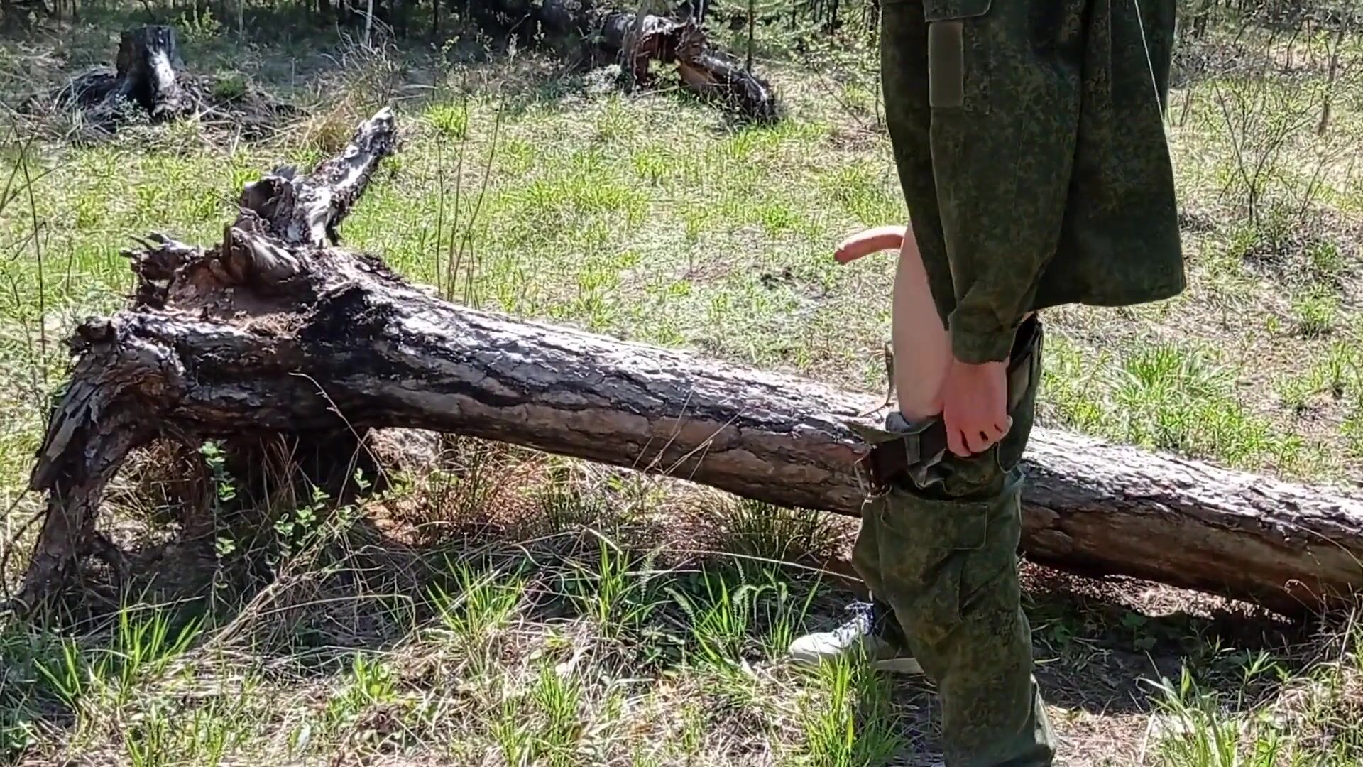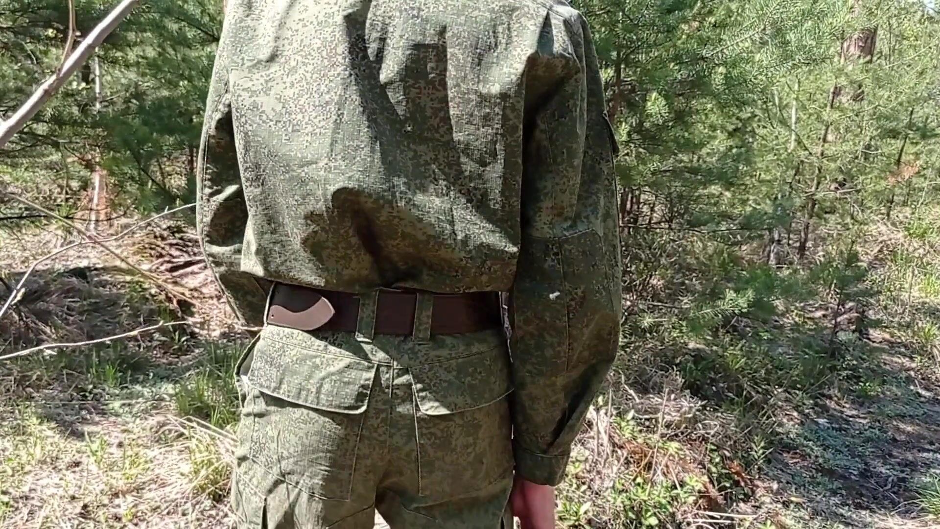 Young handsome soldier jerks off in the forest