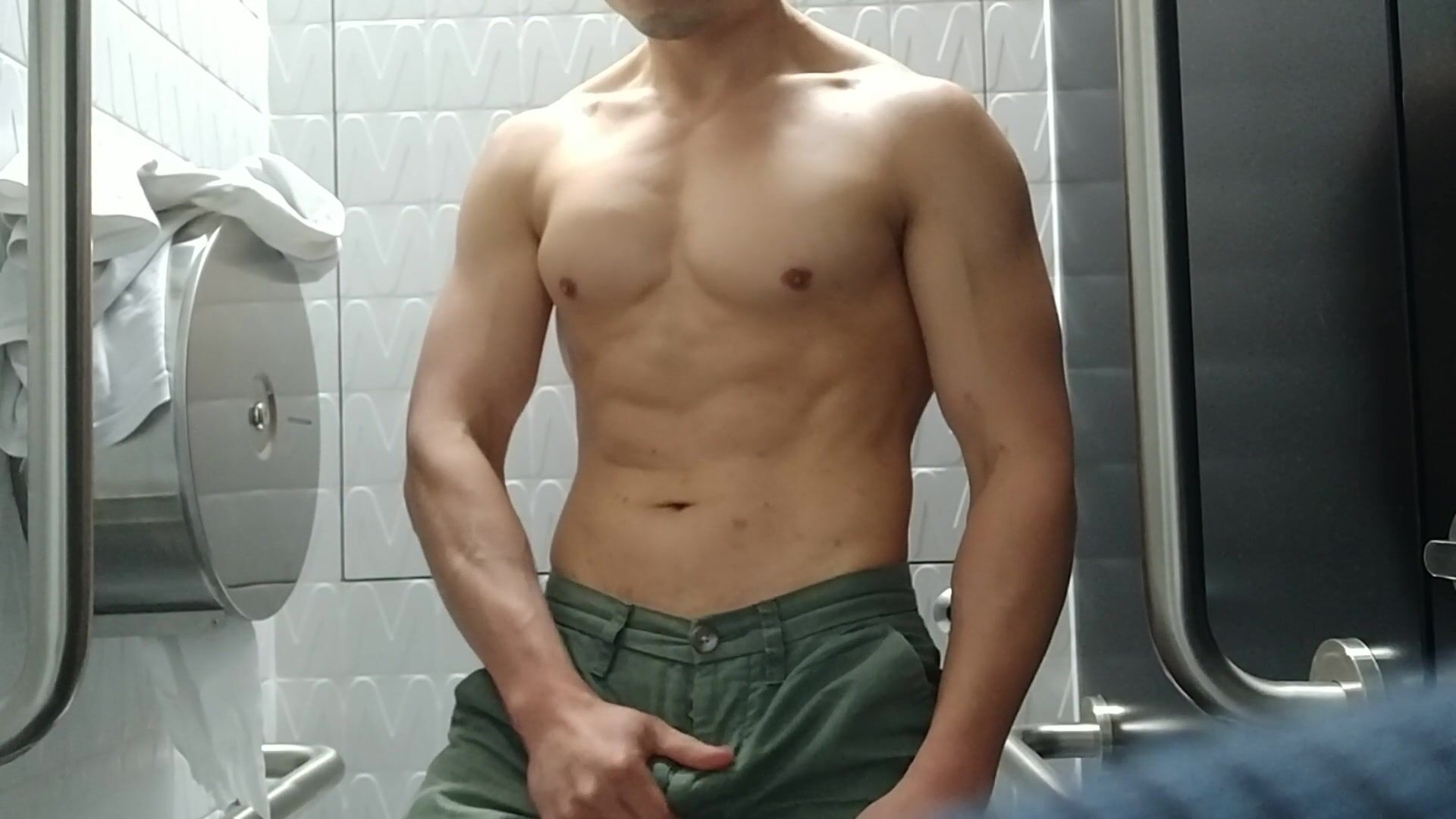 Hot asian dude got horny at the museum, shot a load in the public toilet