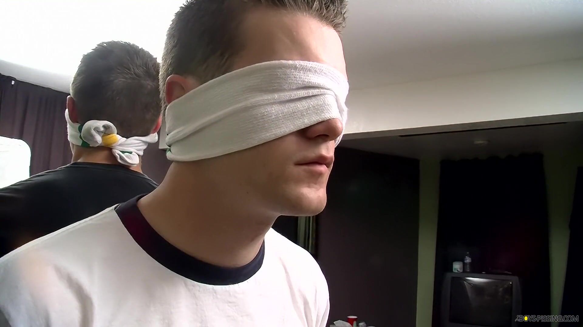 Cocksucker Bryce Corbin blindfolded and pissed on orgy
