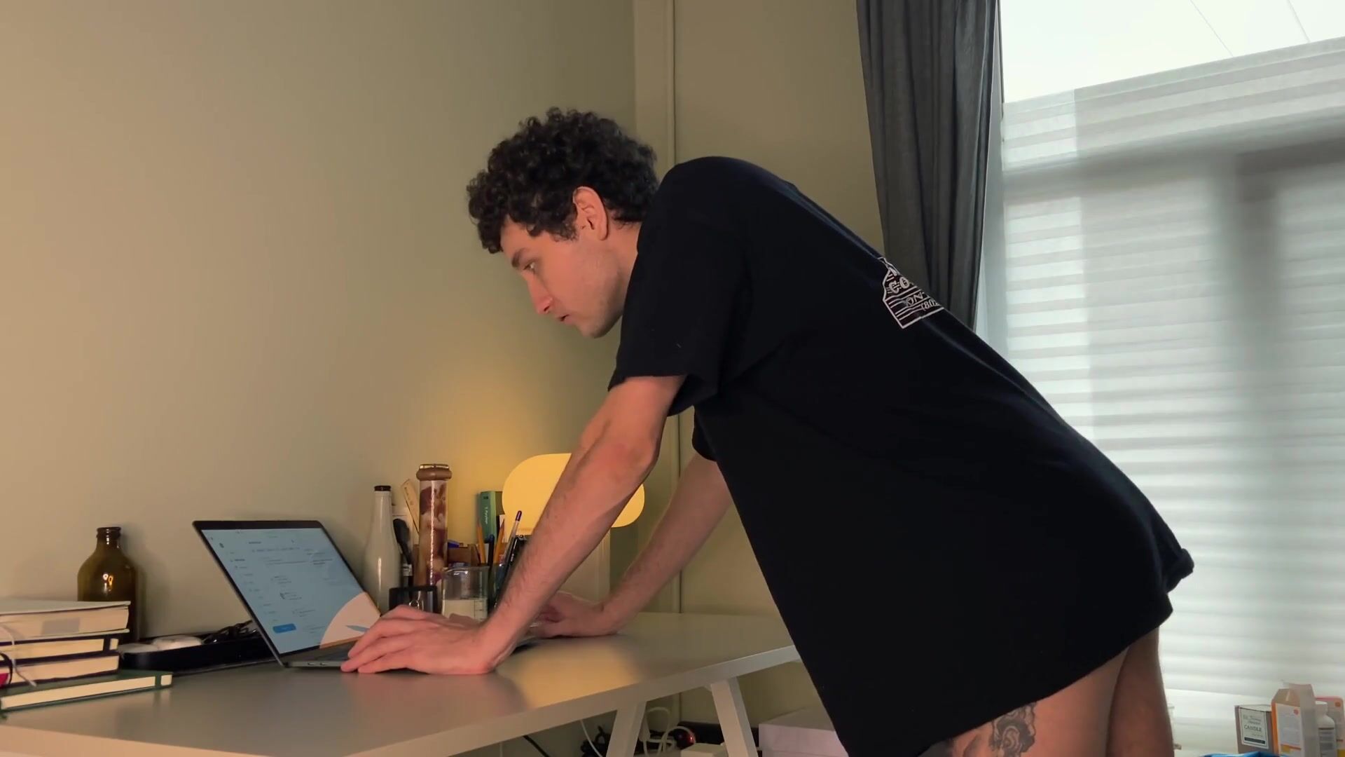 Tattooed guy fucks a deep hole on the table and cums