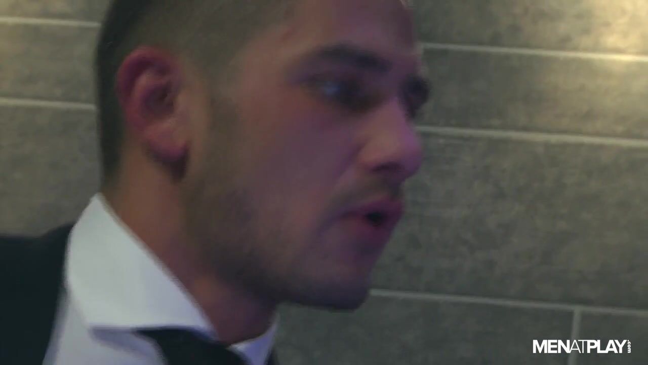 Frisked and Assaulted: Muscular Security Guard Gives Rough Blowjob to Suit-and-Tie Hunk in Public Bathroom