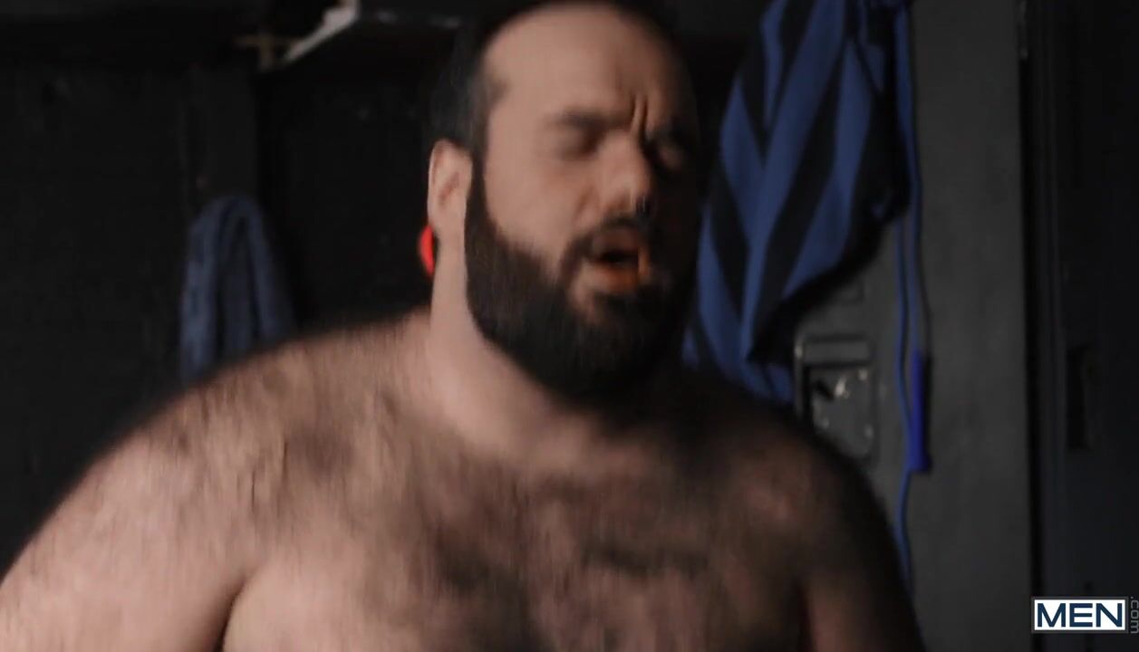 Two bearded rugby players, Jay Cub and Mark Vallant, talk about their favorite toys while changing in the locker room.