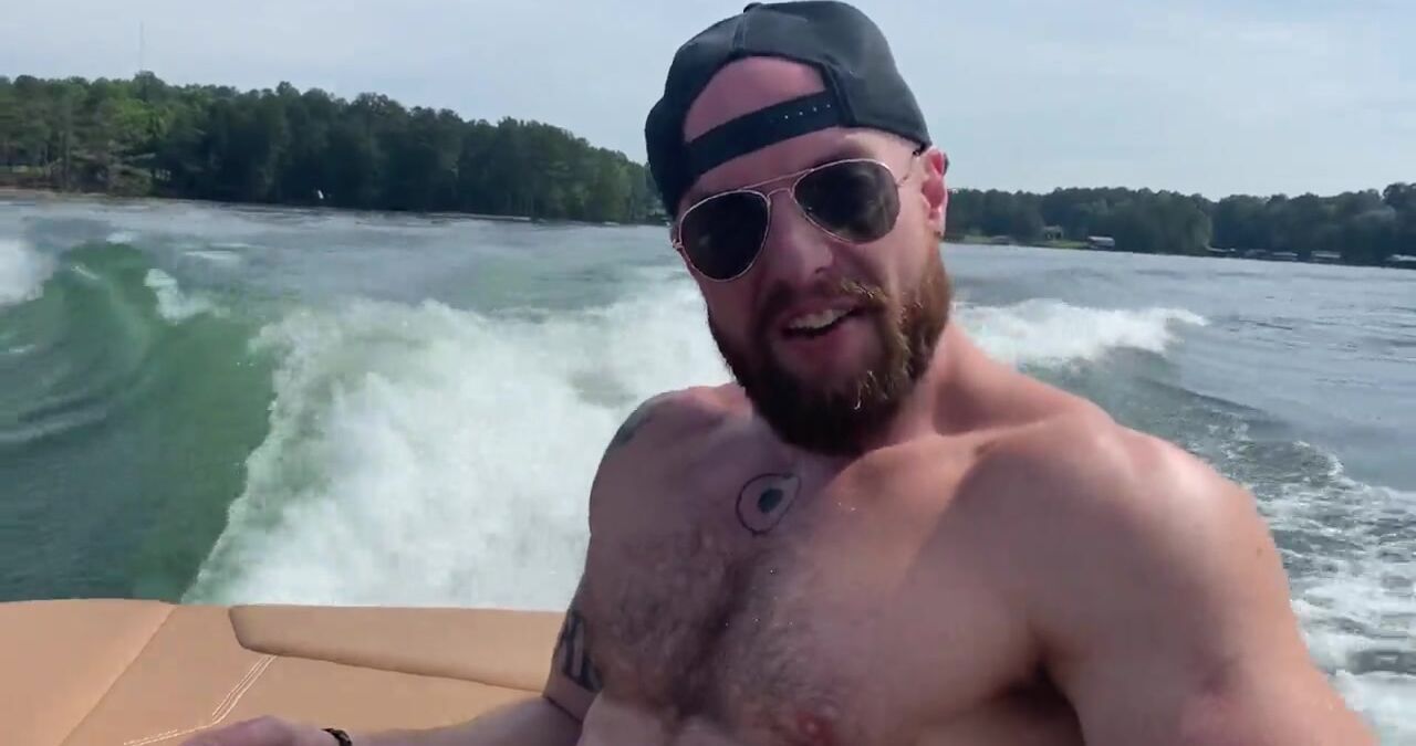 A group of men take a boat to the beaches of the lake for a bareback group session.