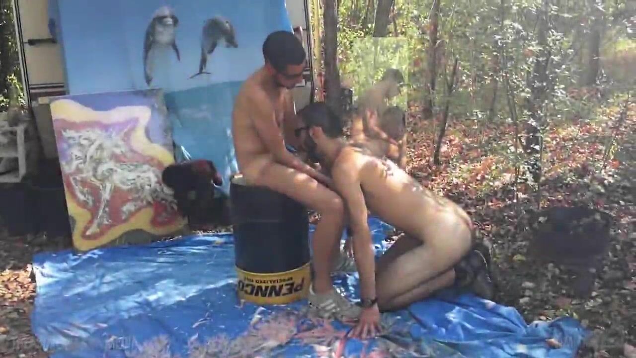 Men engage in bareback anal sex in the forest.
