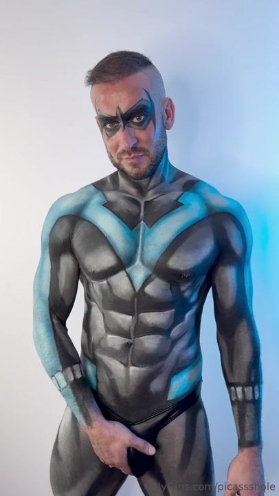 This gay porn video features an amateur-style bodypainting session with Dick Grayson, the former Robin and current Nightwing. The video captures his reaction as he watches a mysterious hand caressing his naked body. This leads to him receiving a handjob that ends in a close-up POV shot of