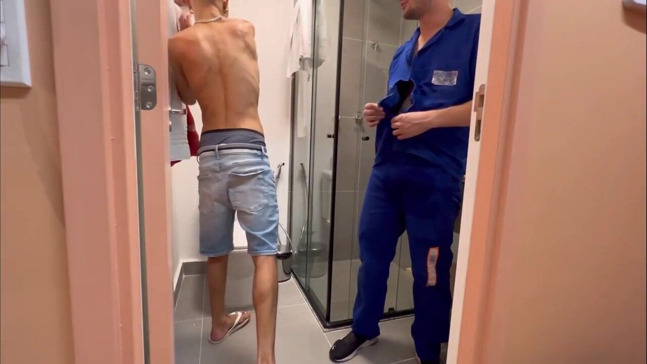 The doorman pleasures a male tenant in the building's apartment complex.