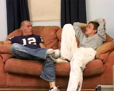 A young twink on the couch is getting sucked and fucked by a daddy.