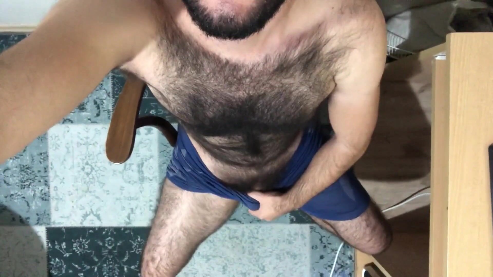 Long hairy men masturbation and cum on table