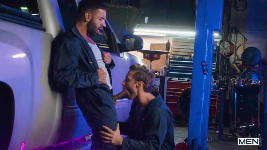 Dom King asks his mechanic Mateo Zagal for a wrench and sees the big tool in his pants! While Dom is under the truck, Mateo undresses him and sucks his dick. The roof rolls out and sucks Mateo, then places him against the side of the vehicle to ass-fuck this hole. Mateo climbs on the roof, then they climb into the truck bed for a hot makeout session that ends in an explosive orgasm!
