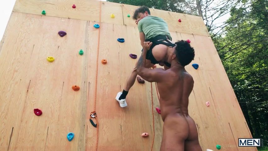 Kenzo's climbing partner Danny Fantasy notices that he's staring at him while adjusting his harness around his big dick. Danny drops his shorts and rubs himself against the massive bulge of Kenzo. As Danny climbs, Kenzo moves behind the wall to stick his dick in a hole, motivating Danny to suck it off. Kenzo gets under the climber to rip his shorts and lick his ass, then fucks him doggy-style and missionary while he's suspended on the wall. They make good use of the ropes, and Danny climbs each inch of this dick before he cums by riding Kenzo, then by taking a facial.