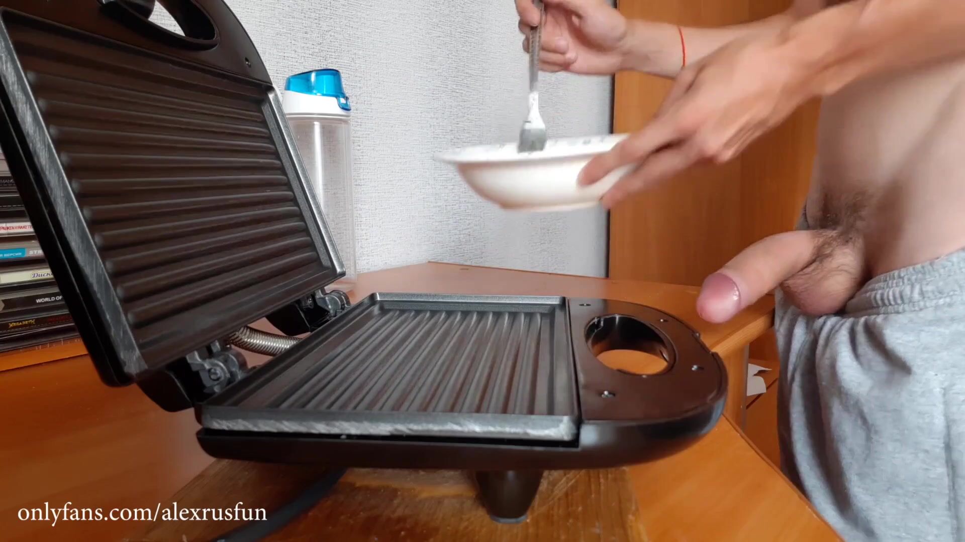 A horny teen with a big dick cooking breakfast for you and fills it with fresh sauce from his sperm