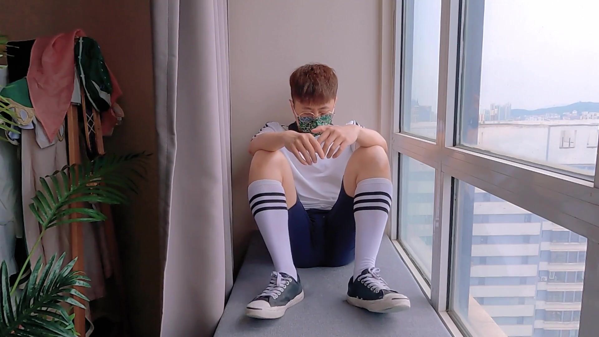 Boy in school uniform masturbates and cums by the window