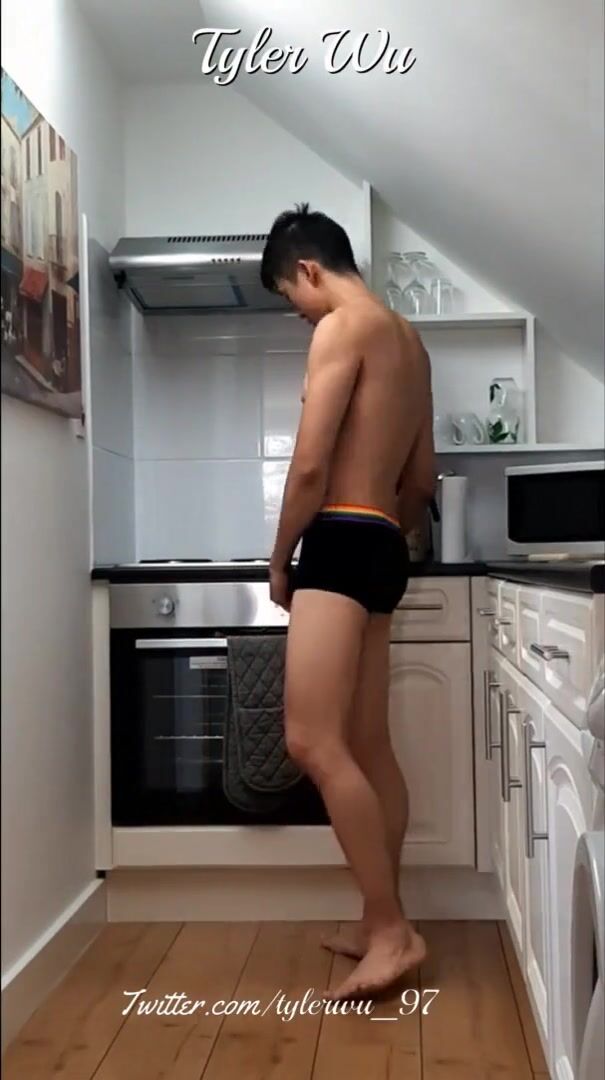 Asian boy verbal jerking and flexing in the kitchen