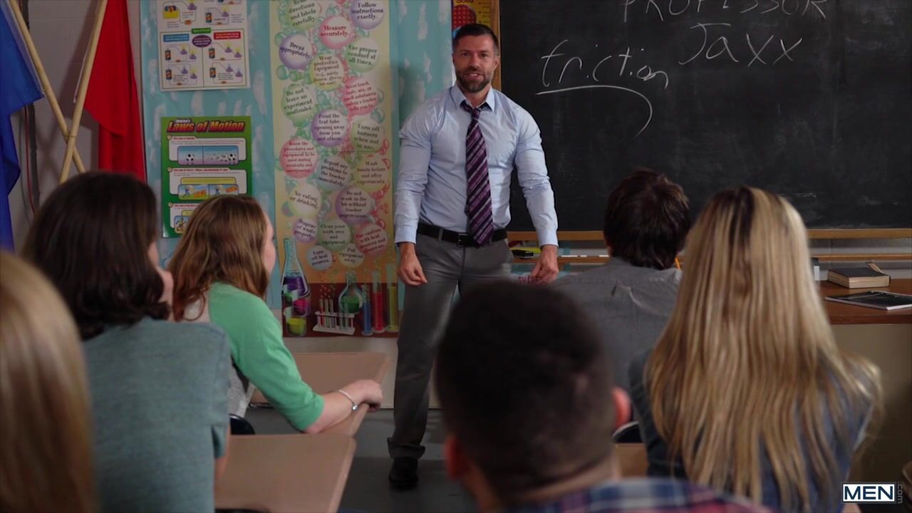 Beautiful Banks giggles in class. A clapping of fingers and his teacher Tristan Jaxx is suddenly naked and ready for a private lesson, the office isn't made for writing... it's for kissing!